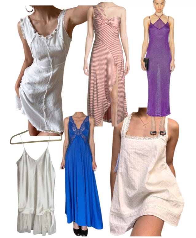 Other dresses of the week include this white Italian linen dress ($98) with the button detailing around the collar—I would potentially have it shortened to make it more of a mini. This linen babydoll dress ($68) is also great, and so easy to throw on on the days you don’t want to have to think about what to wear. I’ve been eyeing this silk mini with the sheer drop waist ($30) as a potential option for a wedding getting ready look. Either this sheer purple PRISCAVera ($110) or this asymmetrical Simkhai ($110) would be great for vacation, and I love the shade of blue of this vintage 80s slip ($75).