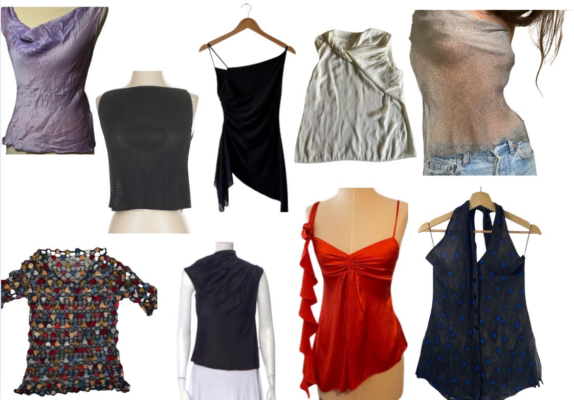 When in doubt, I find that searching the keywords “sheer” “asymmetrical” or “sculptural” always return fruitful results. I’ve been eyeing this silk Dries Van Noten tank ($45) for a bit, and I think this purple one ($20) would look great styled slightly off shoulder. I love the hem details on both this black tunic ($42) and this red silk tank ($80), and the necklines on this Vivienne Tam ($45) and this Anine Bing ($62). This white Lanvin top ($48) would be a great way to upgrade your summer office attire, and I love this silk Kenzo halter ($60) with the subtle blue polka dots. Throwing this fun crochet number ($25) into the mix because, why not! I would totally wear this for a night out in the city, or as a beach cover up.
